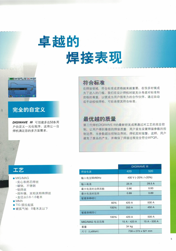 本系列 MIG 焊機集八大技術革新和專利技術( “ 柔性 ” 短弧 / “動態”短弧 / 低噪音脈沖 / 超射流模式 / 熱起動 /4 階程 / PR-SPRAY 系統 / 定序功)于一身,是目前較先進的鋁合金 MIG 焊機之一。獨到的熱起弧功能保護在起弧處充分熔合,大于 700A 的熱起弧脈沖峰值電流擊碎表面氧化層準確而連續地控制脈沖參數,同時對焊接峰值電流不進行限制。