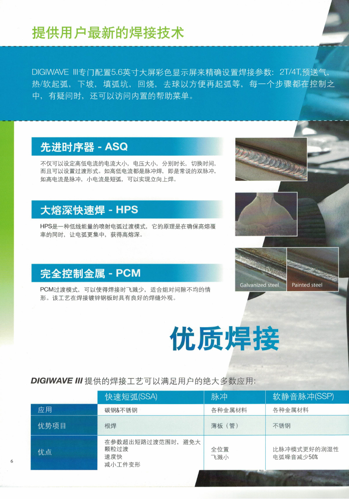 真正實現一個脈沖過渡一個熔滴,該專利工藝采用電弧射流型突變技術,焊接電流以肯定的頻率產生突變,從而引起焊接熔池強烈攪拌,使氫在熔池凝固過程中充分溢出,因此很大地減少和消除氣孔地產生。 SAF 分司的專利射流過渡技術之于傳統的 MIG 焊射流過渡更具有廣泛的應用性,并能實現全位置的焊接,在汽車、造船、高速列車、航天航空及壓力容器等制造領域得到廣泛應用。 SAFMIG330TRI/480TRI 脈沖熔化極氣保護焊機為 16 位微處理器閉環數字控制晶體管暫斬波電源、焊機內焊接專家系統,各種母材,焊絲,氣體組合焊接程序達 100 多組,協合式單旋鈕調節,具有熱起弧功能,此外還設置了“雙脈沖”功能,適用于鋁及鋁合金,不銹鋼,碳鋼及低合金鋼的焊接。