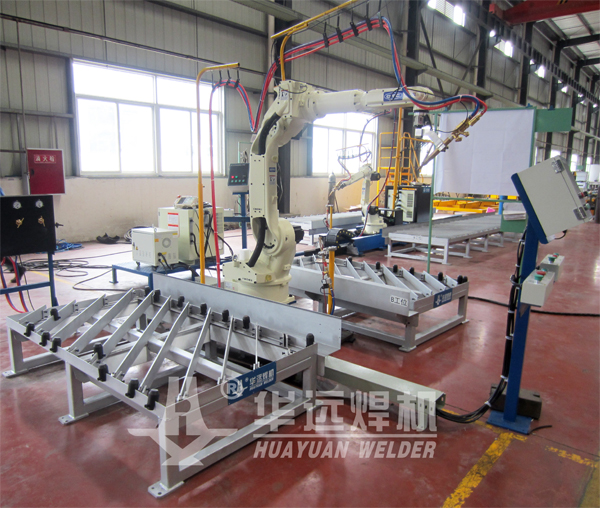 雙工位切割機器人工作站主要用于電力機車和煤機產品碳素鋼、低合金高強度鋼板材坡口的切割加工。為有效提高生產效率,減小工人勞動強度,工作站采用H型雙工位布局,兩個工位平行分布于機器人前后兩側。采用預約工作方式,一個工位切割的同時,另一工位進行工件的裝卸。