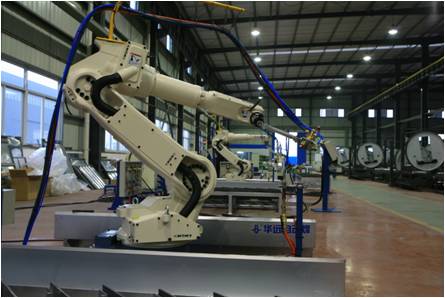 雙工位切割機器人工作站主要用于電力機車和煤機產品碳素鋼、低合金高強度鋼板材坡口的切割加工。為有效提高生產效率,減小工人勞動強度,工作站采用單機器人雙工位平行布置方式,即:單套座式切割機器人+雙套切割平臺。機器人選用日本OTC公司生產的AII-V6L型機器人,工作半徑達2006mm。該機器人具有臂伸范圍廣,負載大等特點,特別適合于切割加工的應用。